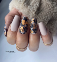 Wenn Sie in der Farbpalette der Stempellacke keine Untergrundfarbe gefunden haben, die zu Ihrem Design passt, versuchen Sie es mit einer Farbe aus Ihrer Gellack-Linie. Tragen Sie eine kleine Menge Gellack in einer dünnen Schicht auf die Oberfläche des Silikonstempels auf. Nach einer Weile beginnt der Gellack auf dem Stempel zu schrumpfen und bildet Flecken, die Sie als Basis (Untergrund) für Ihre STAMPI-Nagelkunst verwenden können. Verwenden Sie den Stempel, um diese Flecken auf Ihren Nagel zu übertragen, und lassen Sie sie für 60 Sekunden in einer UV/LED-Lampe polymerisieren. Anschließend können Sie mit der Gestaltung Ihres Gesamtdesigns mit STAMPI-Stempeln beginnen.